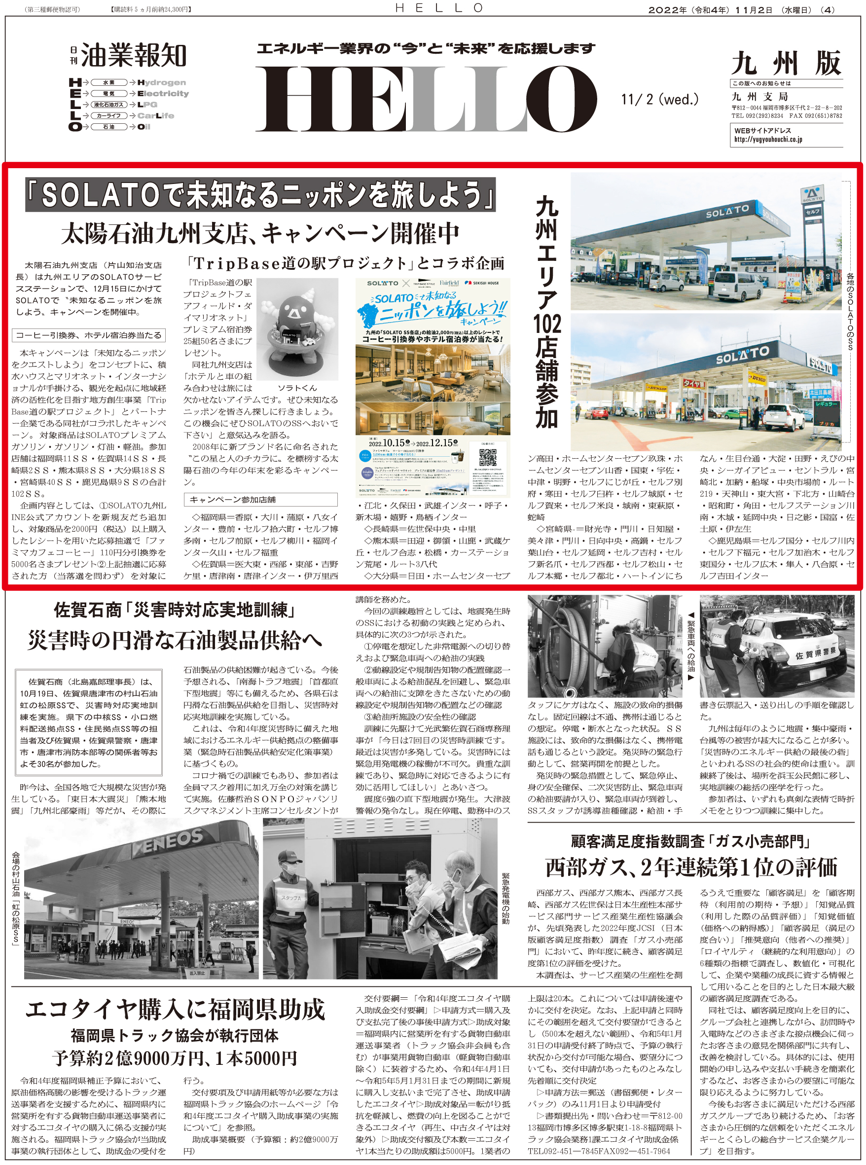 太陽石油九州支店・102店舗参加 未知なるニッポンを旅しよう ※ 画像をクリックすると大きなサイズでお読みいただけます ※ 過去の記事一覧 〒104-0033東京都中央区新川2-6-8 TEL: 03(3551)9201 FAX: 03(3551)9206