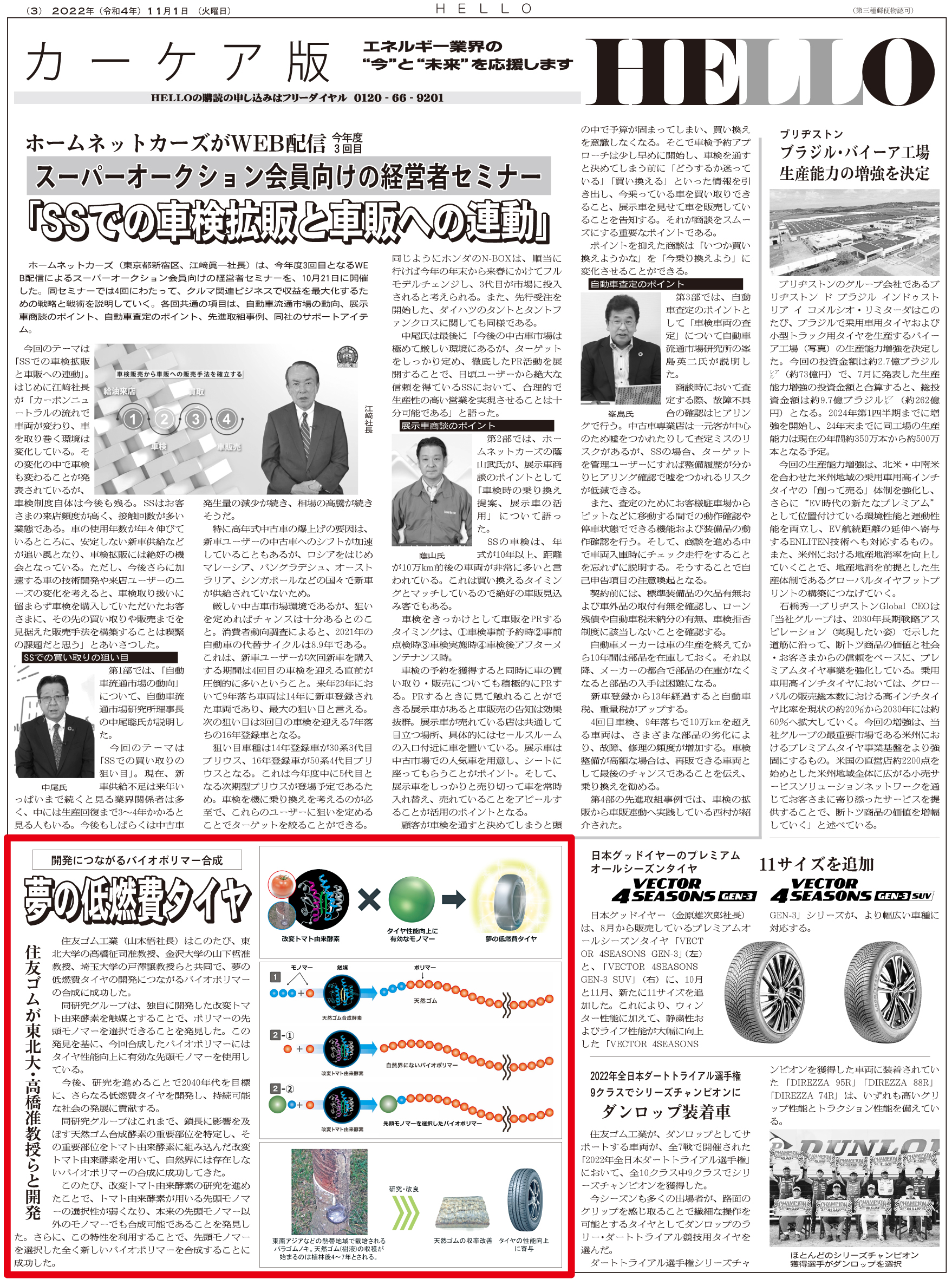 住友ゴムがバイオポリマー合成に成功 夢の低燃費タイヤ ※ 画像をクリックすると大きなサイズでお読みいただけます ※ 過去の記事一覧 〒104-0033東京都中央区新川2-6-8 TEL: 03(3551)9201 FAX: 03(3551)9206