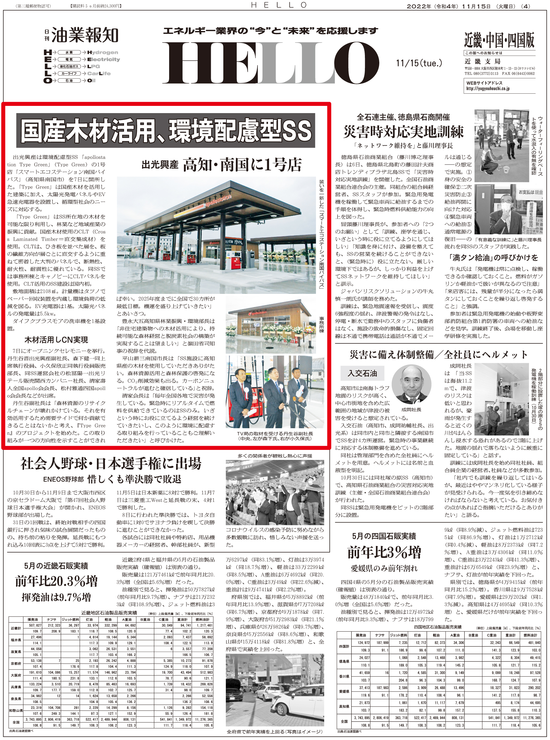 出光が高知・南国市に1号店 国産の木材活用 環境配慮型SS ※ 画像をクリックすると大きなサイズでお読みいただけます ※ 過去の記事一覧 〒104-0033東京都中央区新川2-6-8 TEL: 03(3551)9201 FAX: 03(3551)9206