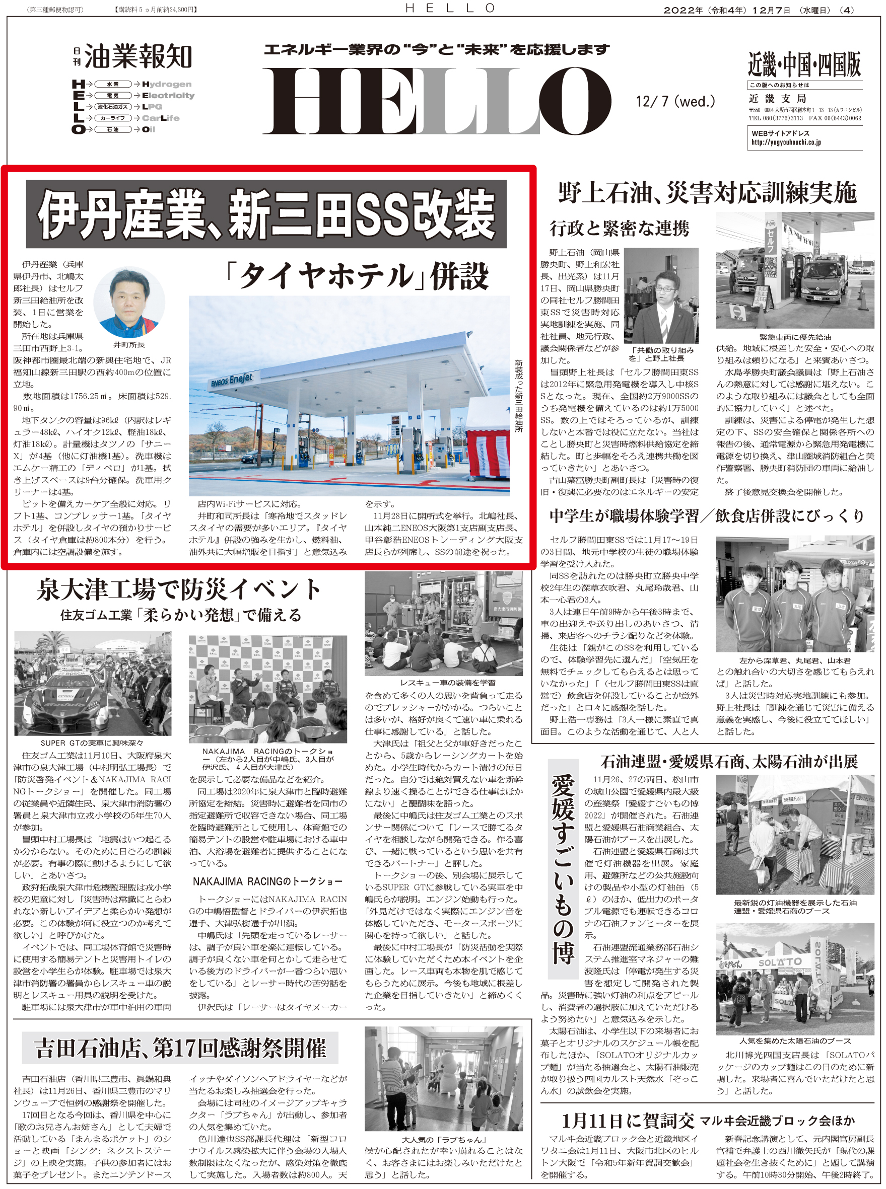 兵庫・伊丹産業が新三田SS改装 「タイヤホテル」併設 ※ 画像をクリックすると大きなサイズでお読みいただけます ※ 過去の記事一覧 〒104-0033東京都中央区新川2-6-8 TEL: 03(3551)9201 FAX: 03(3551)9206