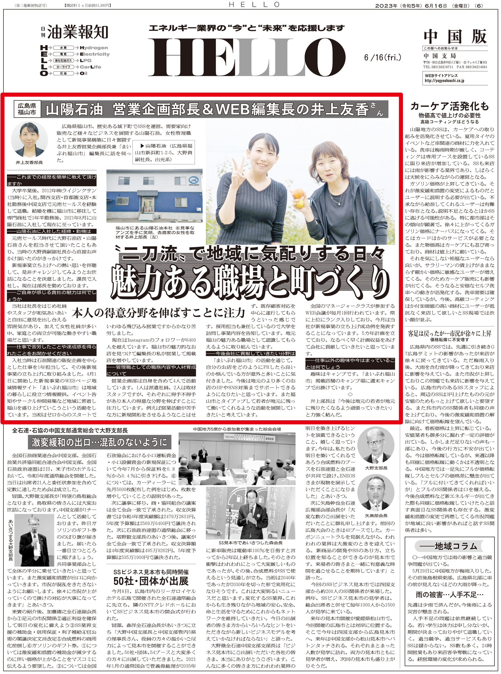 広島・福山市の山陽石油の企画部長・井上友香さん 魅力ある職場と町づくり ※ 画像をクリックすると大きなサイズでお読みいただけます ※ 過去の記事一覧 〒104-0033東京都中央区新川2-6-8 TEL: 03(3551)9201 FAX: 03(3551)9206