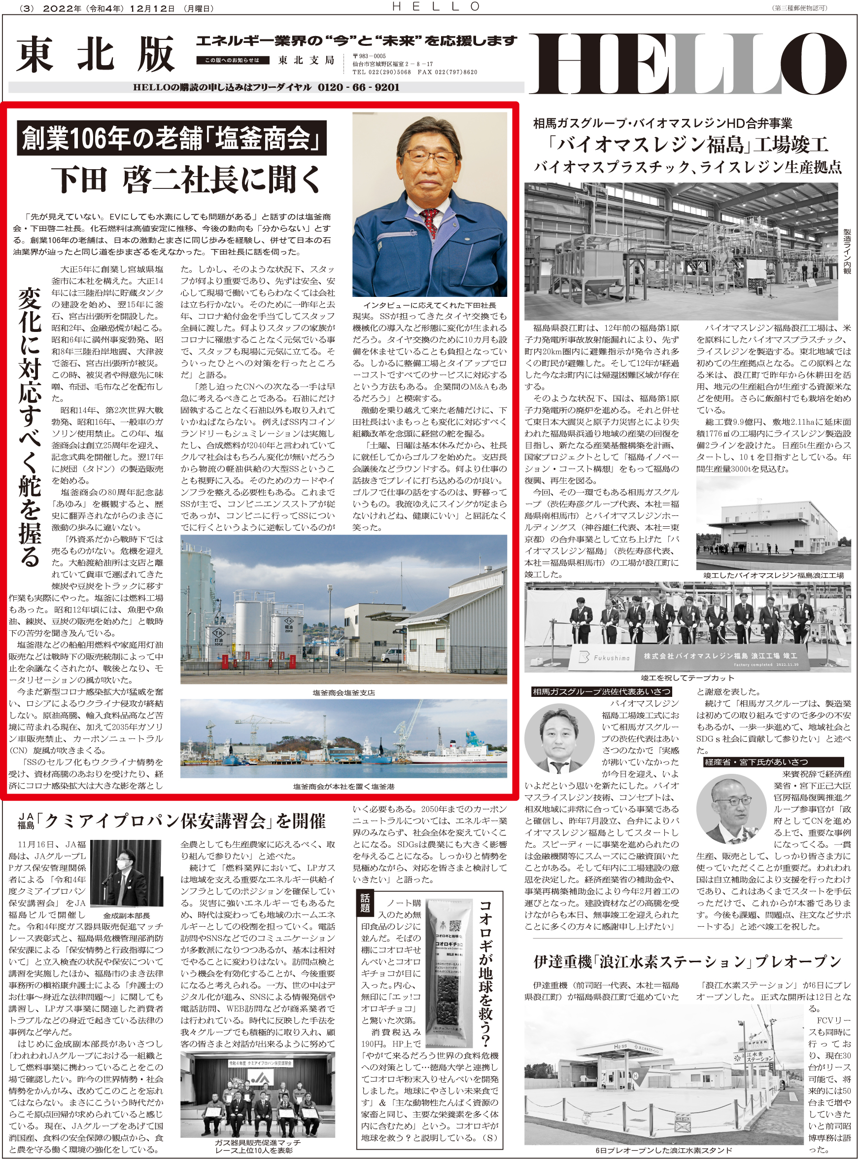 2022.12.12インタビュー塩釜商会 下田社長 変化に対応 ※ 画像をクリックすると大きなサイズでお読みいただけます ※ 過去の記事一覧 〒104-0033東京都中央区新川2-6-8 TEL: 03(3551)9201 FAX: 03(3551)9206