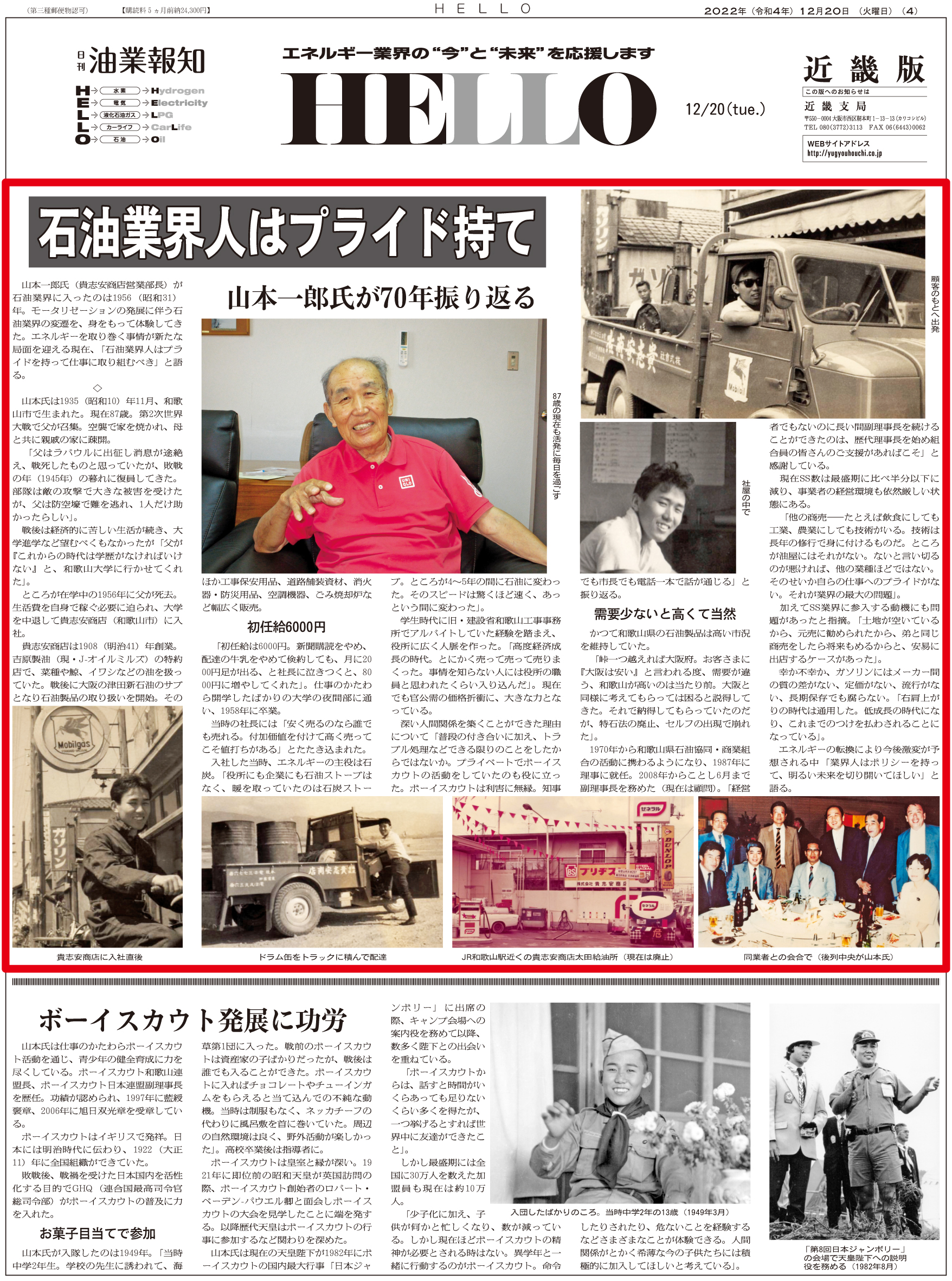 和歌山の貴志安商店・山本一郎氏「石油業界人はプライド持て」 ※ 画像をクリックすると大きなサイズでお読みいただけます ※ 過去の記事一覧 〒104-0033東京都中央区新川2-6-8 TEL: 03(3551)9201 FAX: 03(3551)9206