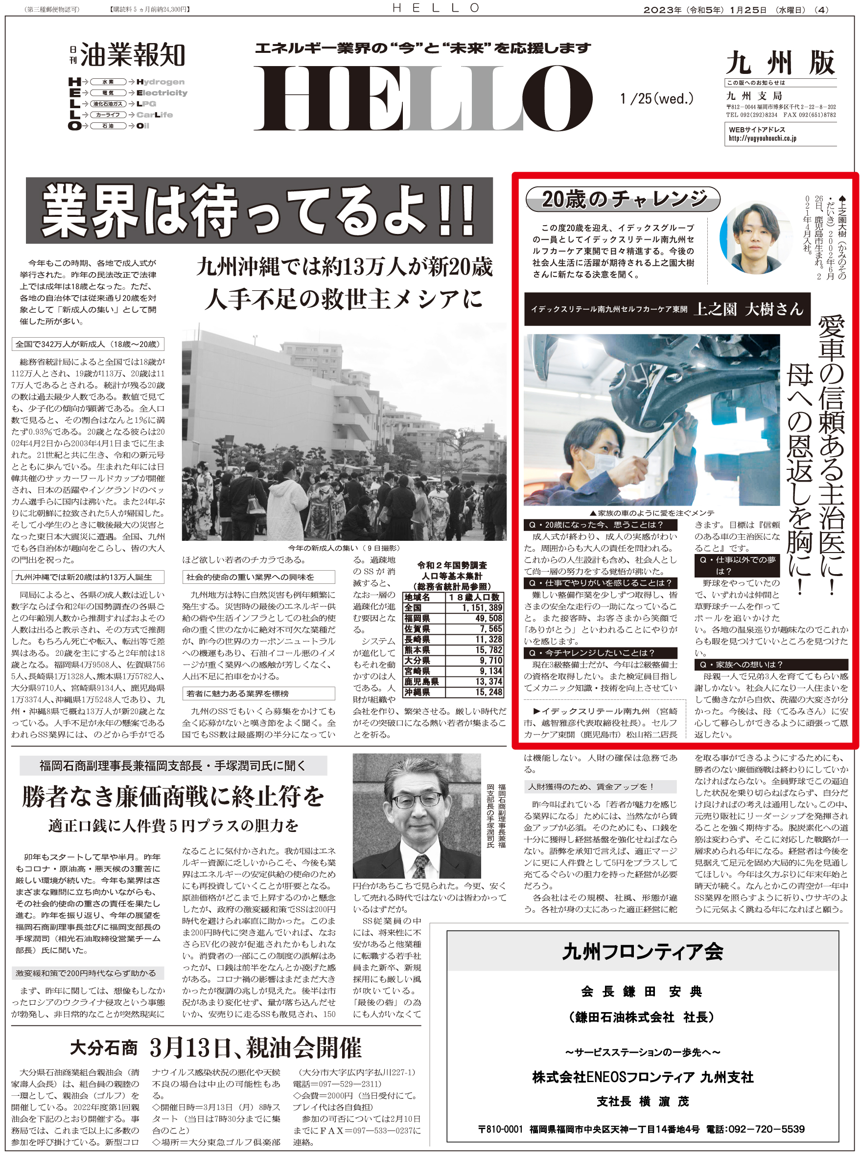 2023.1.25「20歳のチャレンジ」イデックスリテール南九州 上之園 大樹さん ※ 画像をクリックすると大きなサイズでお読みいただけます ※ 過去の記事一覧 〒104-0033東京都中央区新川2-6-8 TEL: 03(3551)9201 FAX: 03(3551)9206
