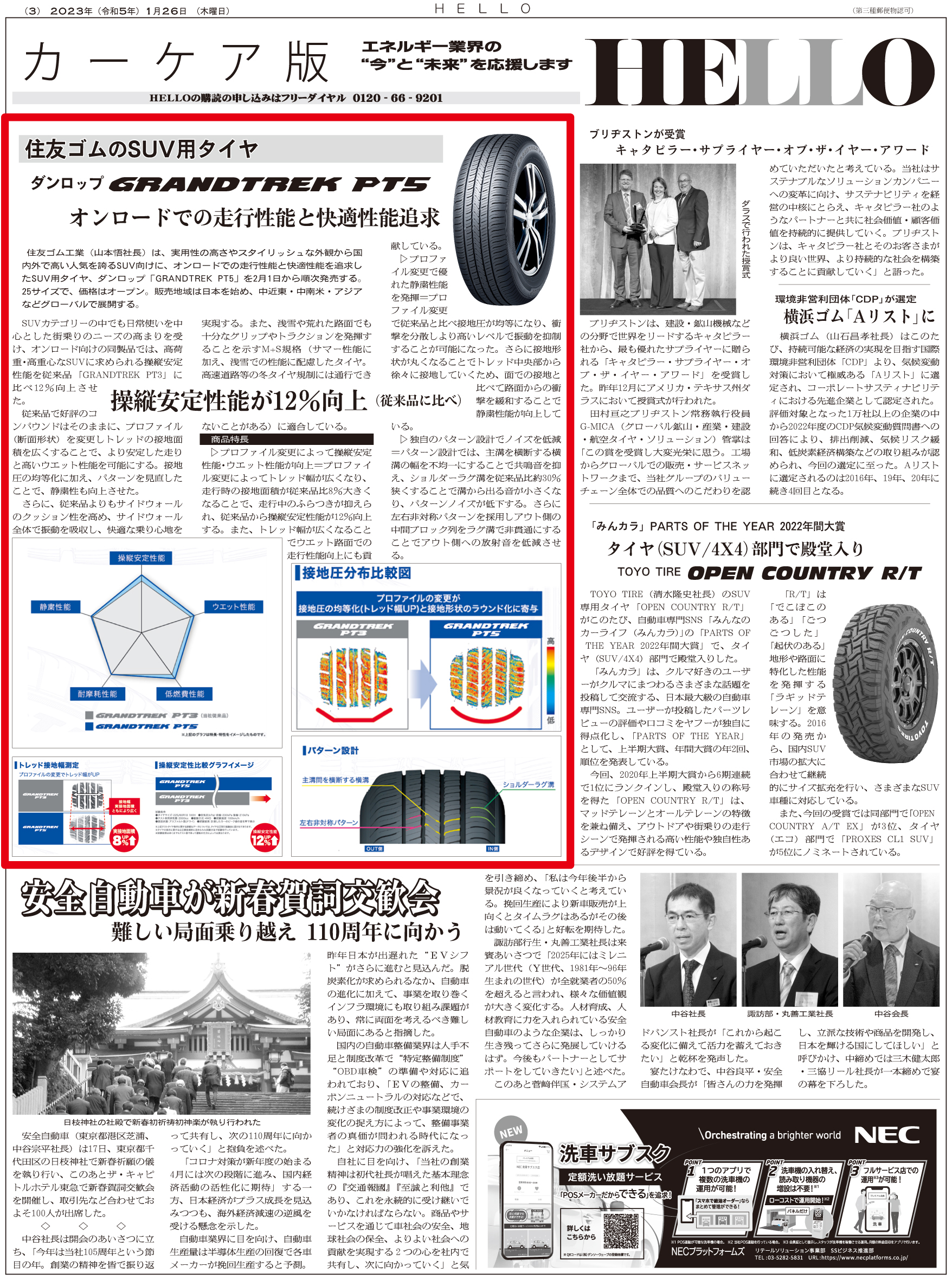 住友ゴムがオンロードの快適性追求 SUV用タイヤ ※ 画像をクリックすると大きなサイズでお読みいただけます ※ 過去の記事一覧 〒104-0033東京都中央区新川2-6-8 TEL: 03(3551)9201 FAX: 03(3551)9206