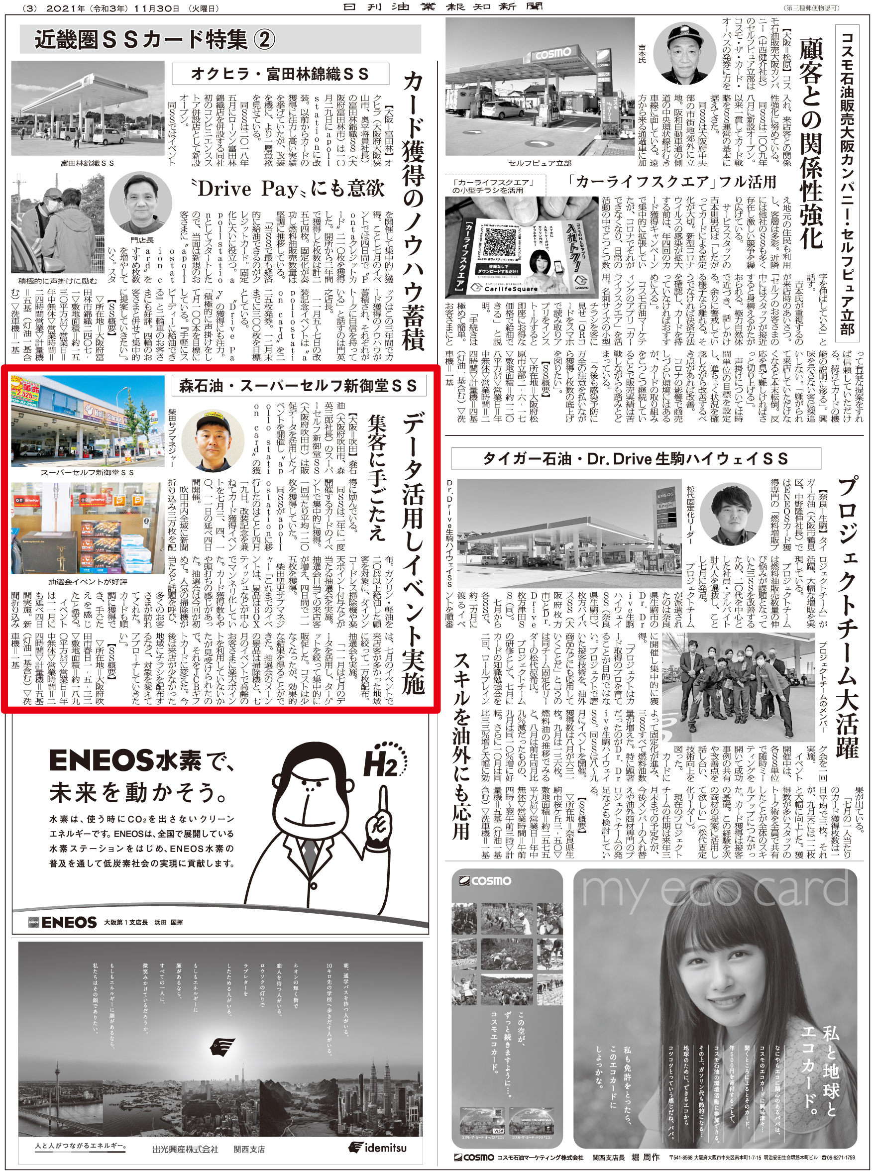 大阪・吹田市の森石油スーパーセルフ新御堂SS データ活用イベントで集客 ※ 画像をクリックすると大きなサイズでお読みいただけます ※ 過去の記事一覧 〒104-0033東京都中央区新川2-6-8 TEL: 03(3551)9201 FAX: 03(3551)9206