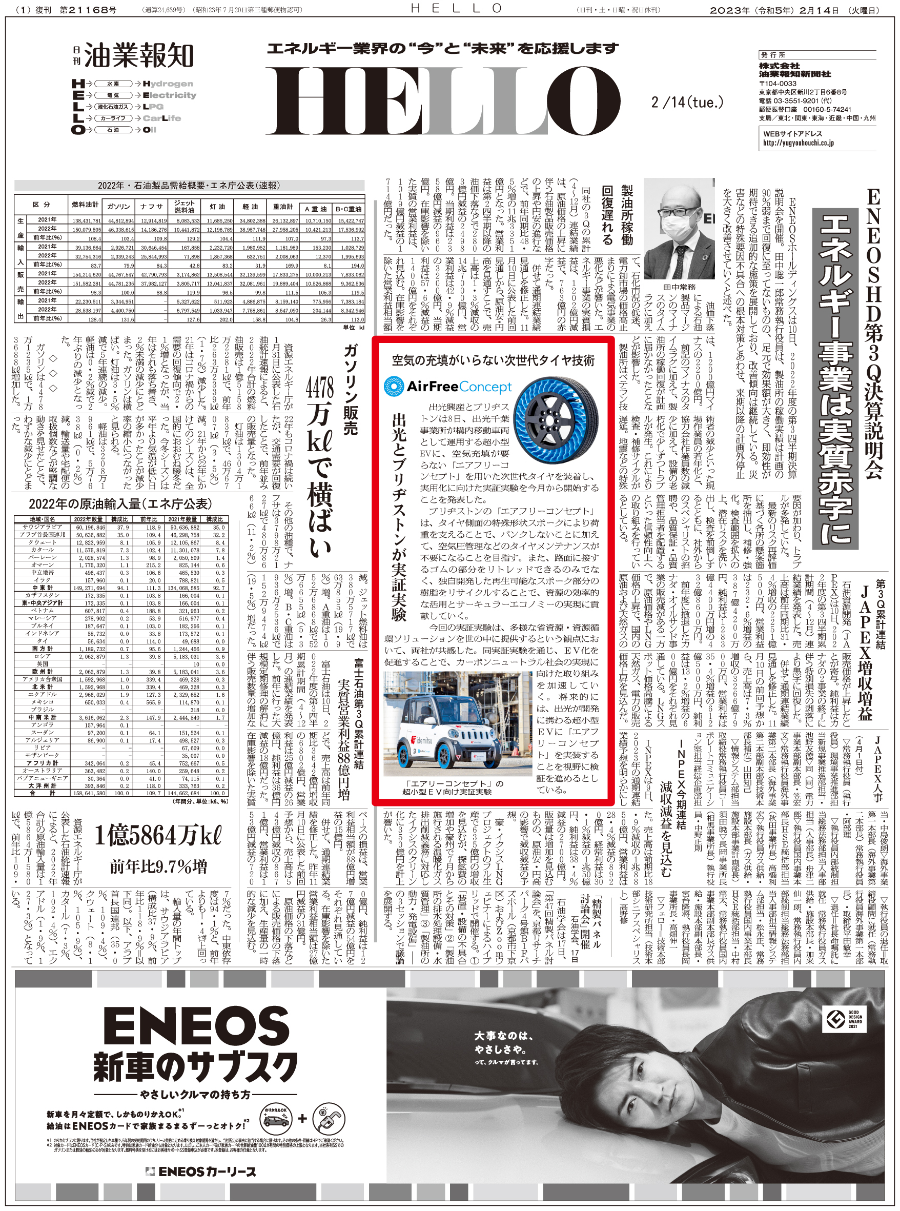 出光とブリヂストンが実証実験 空気充填いらないタイヤ ※ 画像をクリックすると大きなサイズでお読みいただけます ※ 過去の記事一覧 〒104-0033東京都中央区新川2-6-8 TEL: 03(3551)9201 FAX: 03(3551)9206