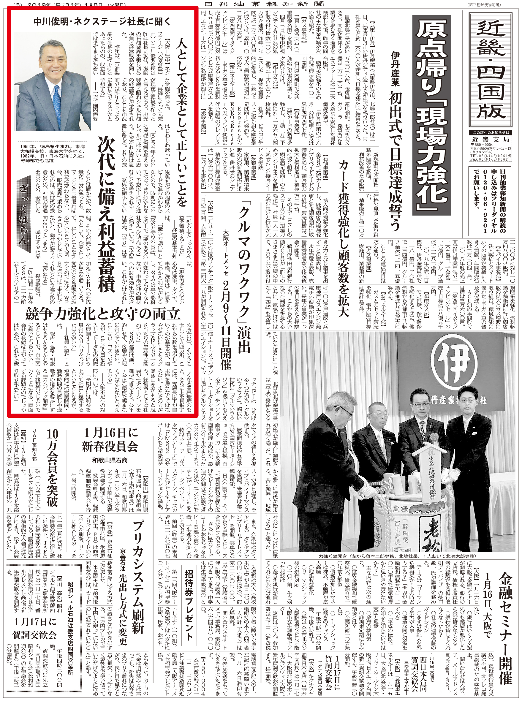 2019.1.8インタビュー 中川俊明ネクステージ社長 次代に備え利益蓄積 ※ 画像をクリックすると大きなサイズでお読みいただけます ※ 過去の記事一覧 〒104-0033東京都中央区新川2-6-8 TEL: 03(3551)9201 FAX: 03(3551)9206